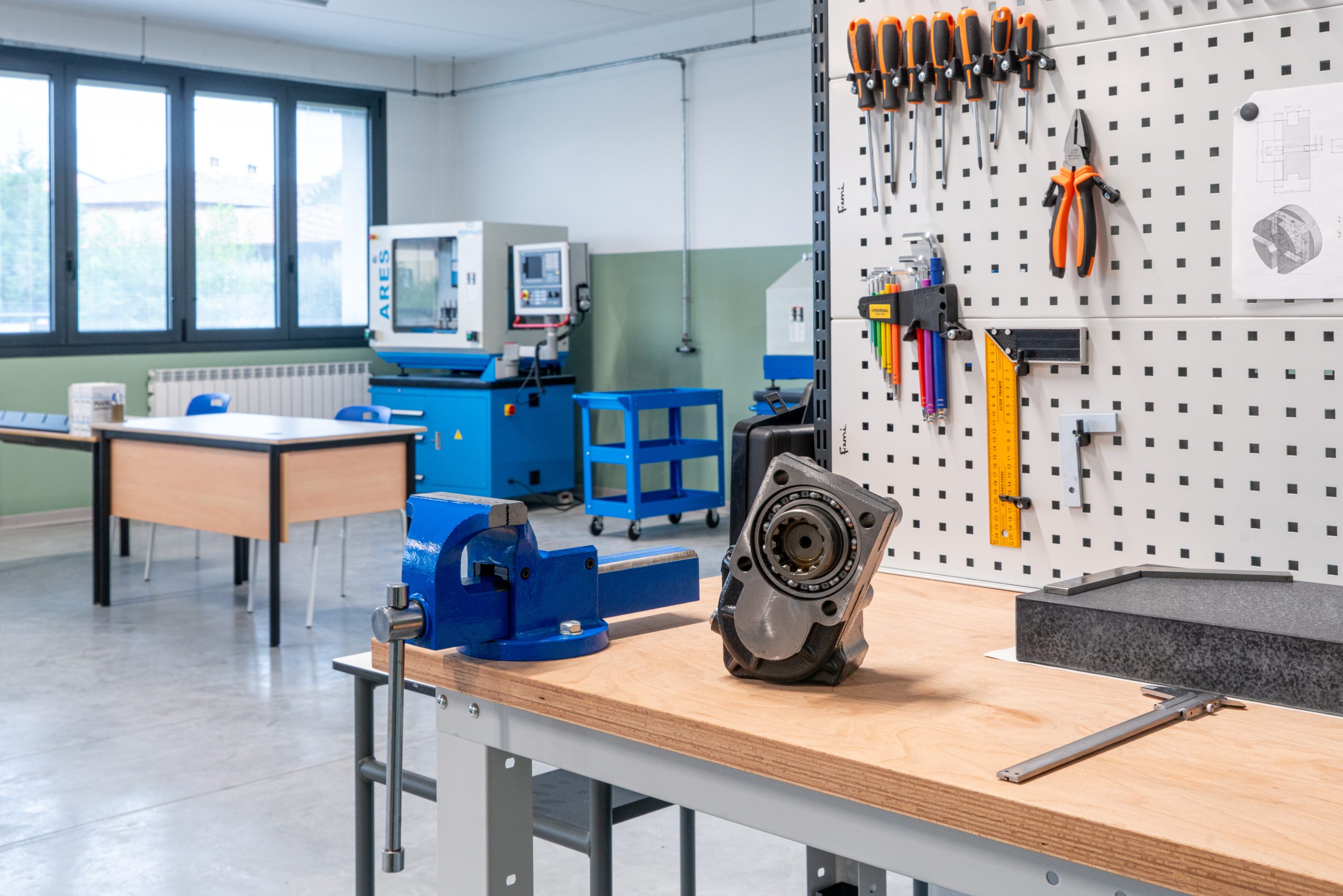 OMFB directly contributed to the setup of the new laboratory by providing resources, expertise, and technical consultancy to equip the space with: a machining center and an Educational Mekhan CNC lathe for prototype production, CAD/CAM software for design and programming, six fully equipped workbenches for assembly, and measuring tools and equipment to ensure maximum precision.